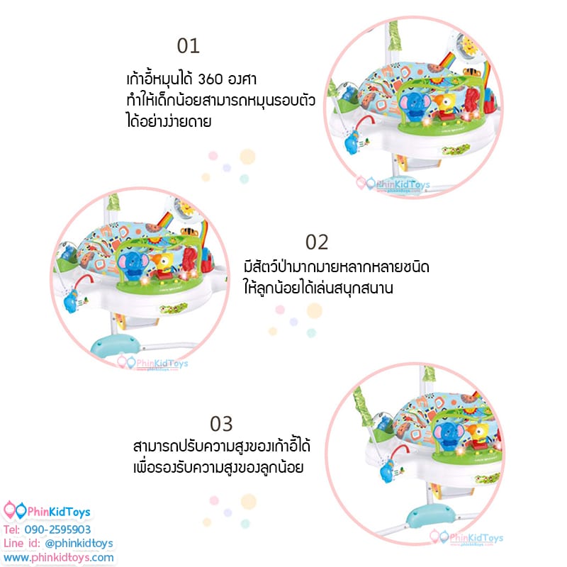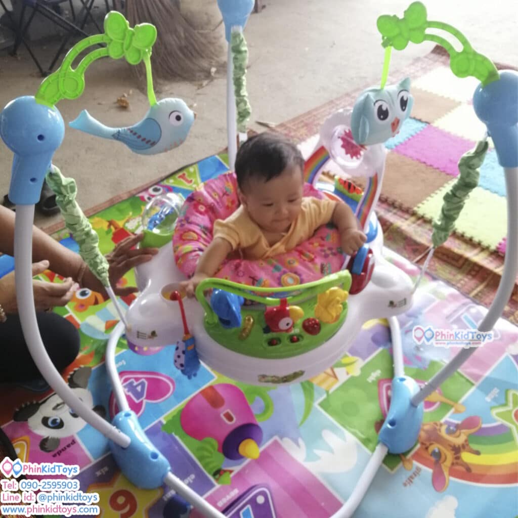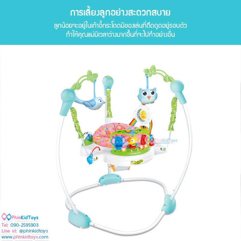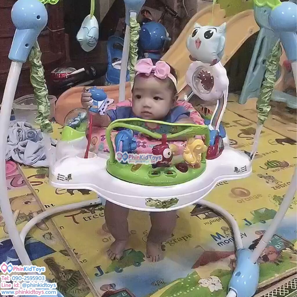 เก้าอี้กิจกรรม เก้าอี้กระโดดโมบายนกฮูก สีฟ้า เบาะสีชมพู ช่วยเสริมสร้างพัฒนาการ การเรียนรู้ต่างๆ เช่น กล้ามเนื้อมือ แขน ขา การมอง การได้ยิน การสัมผัสหยิบจับของเล่นต่างๆและที่สำคัญช่วยเสริมสร้างพัฒนาการทางด้านอารมณ์ของน้องๆได้อย่างดีเยี่ยม