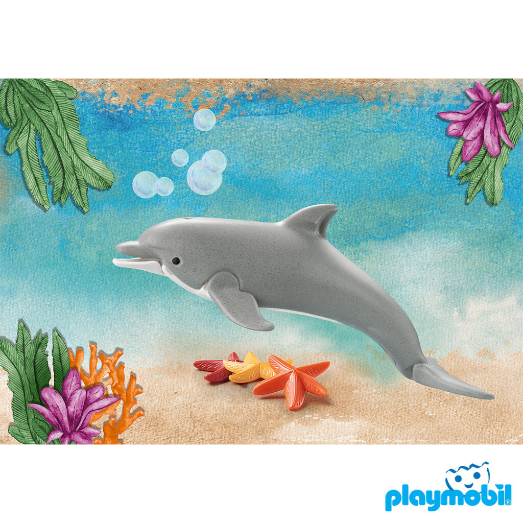 ปลาโลมาอยู่ในทุกมหาสมุทร สัตว์ทะเลขี้เล่นมีความอยากรู้อยากเห็นและช่วยเหลือซึ่งกันและกัน ปลาโลมามีความสามารถในการได้ยินและสื่อสารได้เป็นอย่างดี พวกเขายังใช้การคลิกเพื่อค้นหาอาหาร เรือ และแม้แต่นักดำน้ำที่จะเล่นด้วย โลกแห่งการเล่น Wiltopia จาก PLAYMOBIL เชิญชวนให้เด็กๆ ได้ค้นพบภูมิภาคที่น่าตื่นเต้นในโลกของเราที่คู่ควรแก่การปกป้องและสัตว์ต่าง ๆ มากมาย รวมทั้งการเล่นและการเรียนรู้ในรูปแบบที่ไม่เหมือนใคร ชุด PLAYMOBIL ประกอบด้วยปลาโลมา ปลาดาว 3 ตัว และการ์ดความรู้เกี่ยวกับสัตว์