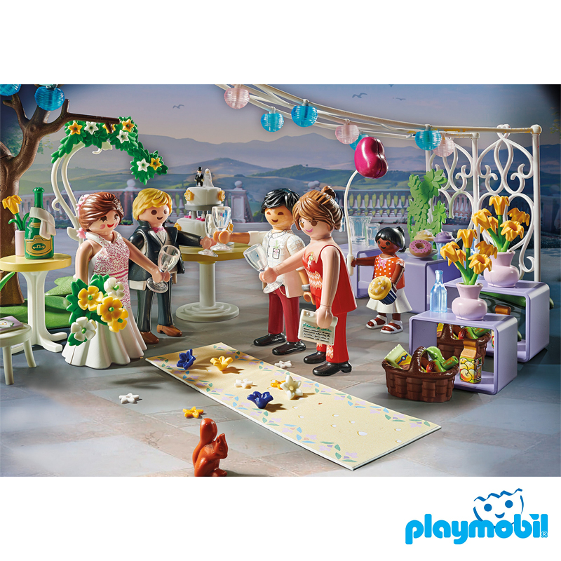 หลังจากวางแผนมาหลายสัปดาห์ งานแต่งงานของคู่รักที่กำลังมีความรักก็เกิดขึ้นกลางแจ้ง เจ้าสาวและเจ้าบ่าวเดินไปด้วยกันตามเสียงดนตรีจากนักดนตรีต่อหน้าบาทหลวงเพื่อแลกเปลี่ยนคำสาบาน สุนัขได้รับเลือกให้เป็นผู้ถือแหวนและอุ้มหมอนแหวนไว้ในปากพร้อมกับกระดิกหาง หลังงานแต่งงาน คู่รักและแขกต่างตั้งตารอที่จะได้เค้กแต่งงานแสนอร่อย มัฟฟิน และเครื่องดื่มเย็นๆ ช่างเป็นวันที่สมบูรณ์แบบ ปาร์ตี้งานแต่งงาน PLAYMOBIL Promo Pack มอบความสนุกสนานสุดโรแมนติกสำหรับเด็กหญิงและเด็กชายอายุ 4 ปีขึ้นไป ชุดของเล่นประกอบด้วยฟิกเกอร์ PLAYMOBIL เจ็ดตัว สุนัข นกพิราบสองตัว กระรอกสองตัว เก้าอี้สี่ตัว ต้นไม้สำหรับติดมาลัย และอุปกรณ์จัดงานแต่งงานที่น่ารักอื่นๆ อีกมากมาย พวงมาลัยพร้อมโคมสามารถติดไว้กับต้นไม้หรือโครงบังตาที่เป็นช่องได้